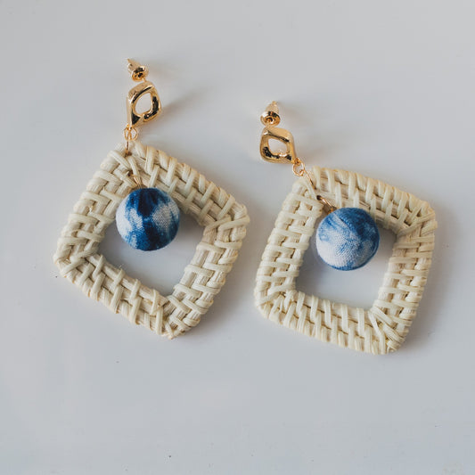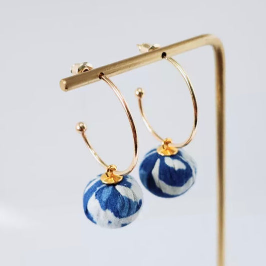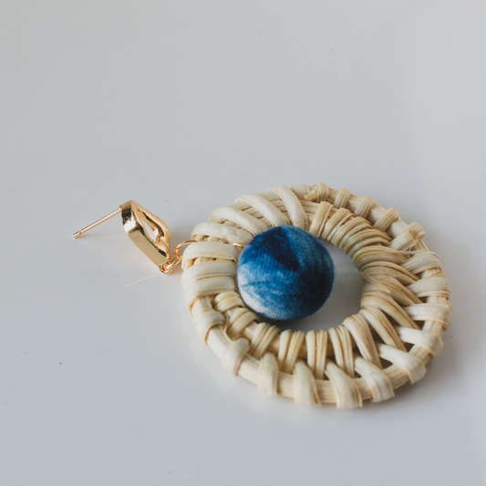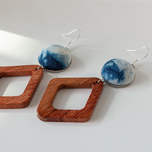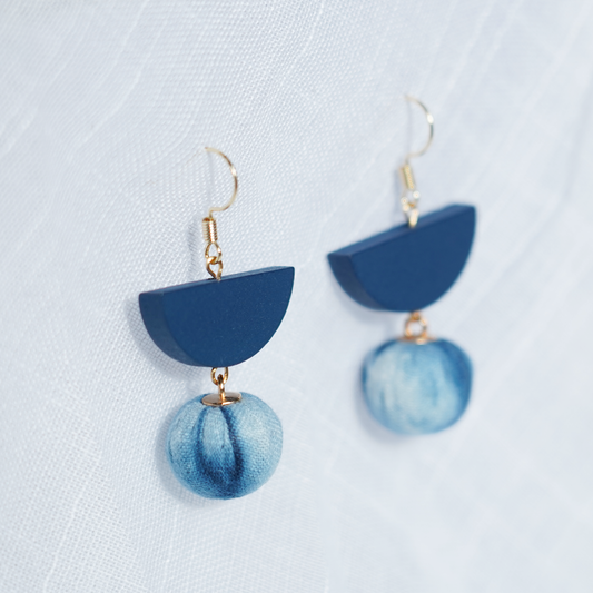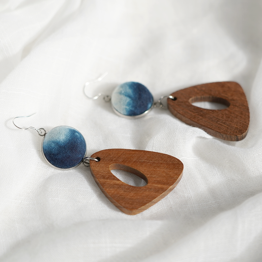 Jewelry crafted from cyanotype printed cloth, pearls, and natural wood.