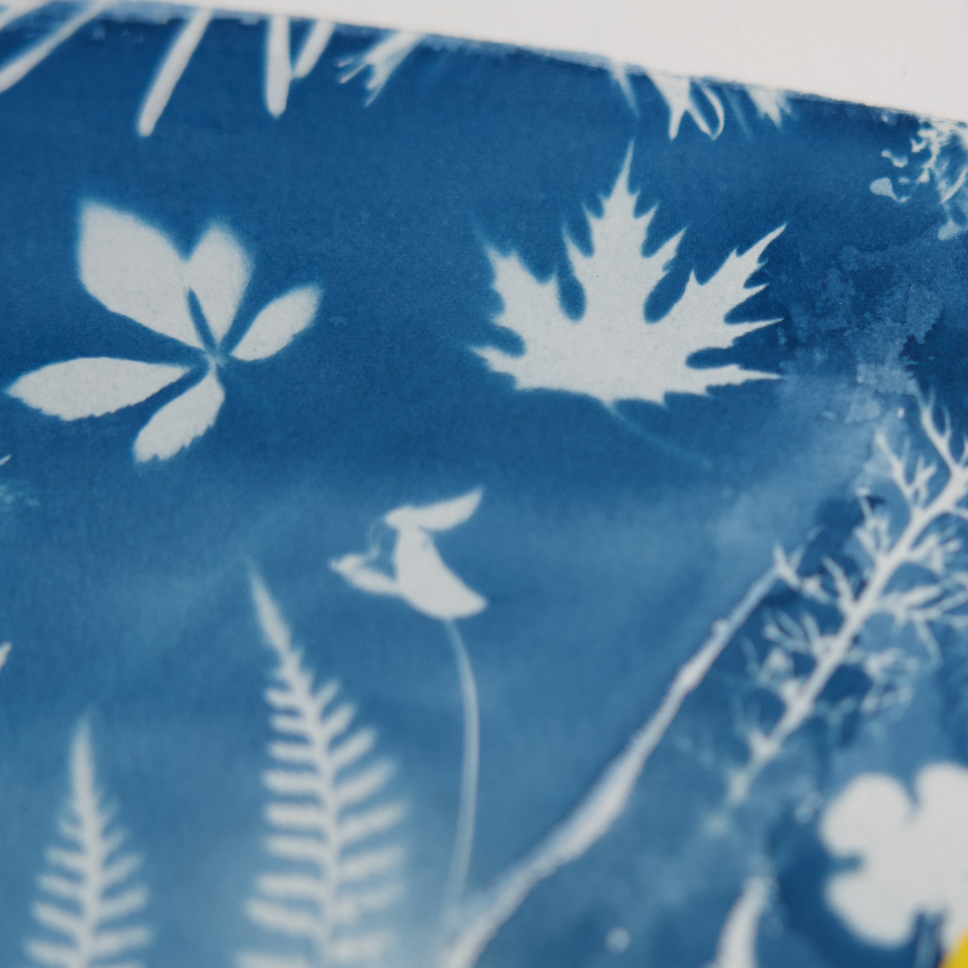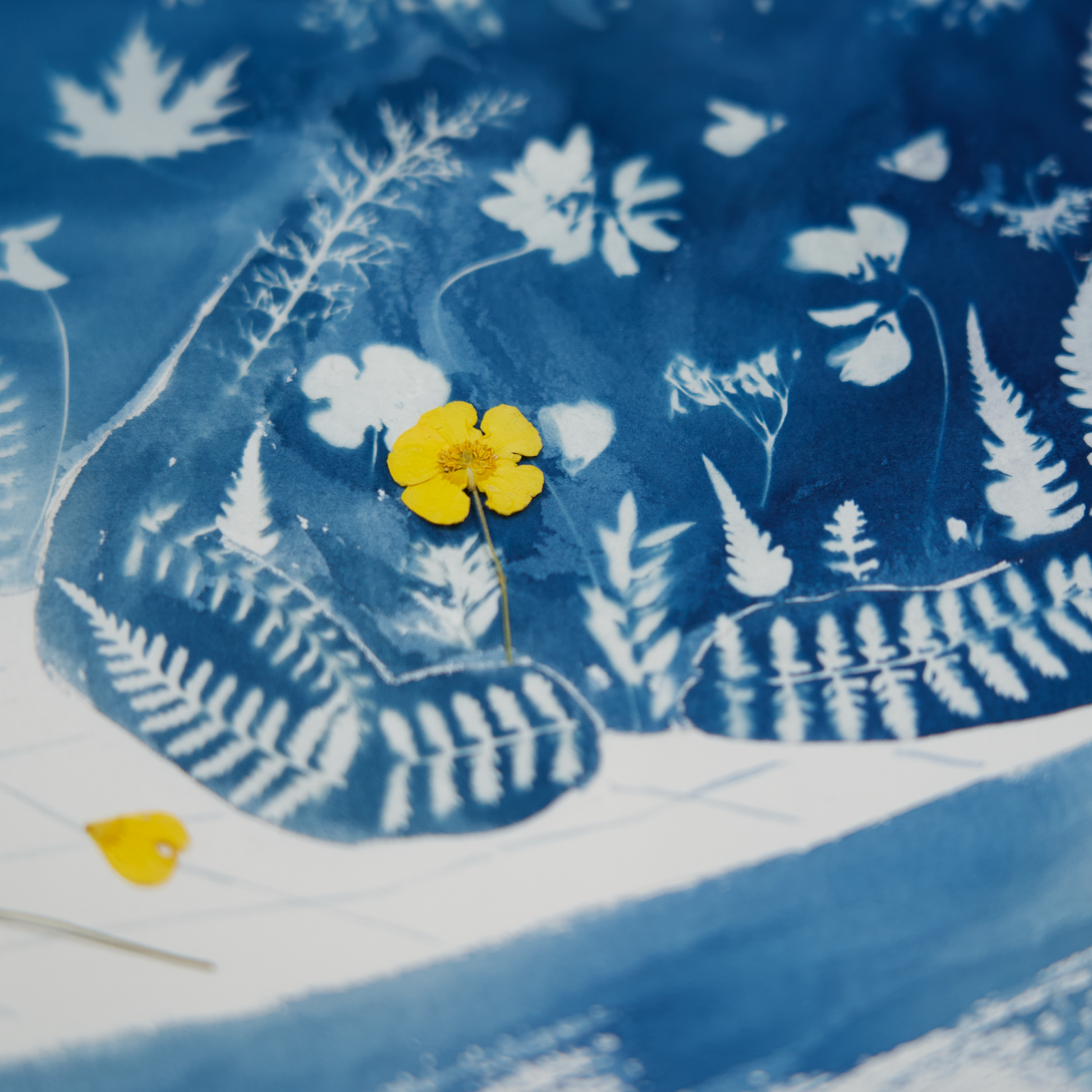 Cyanotype is a photographic process that produces a Prussian blue monochrome print. Developed in 1842, this technique utilizes a photosensitive solution that reacts to sunlight exposure. Plants act as UV shields, leaving their impressions on the paper.