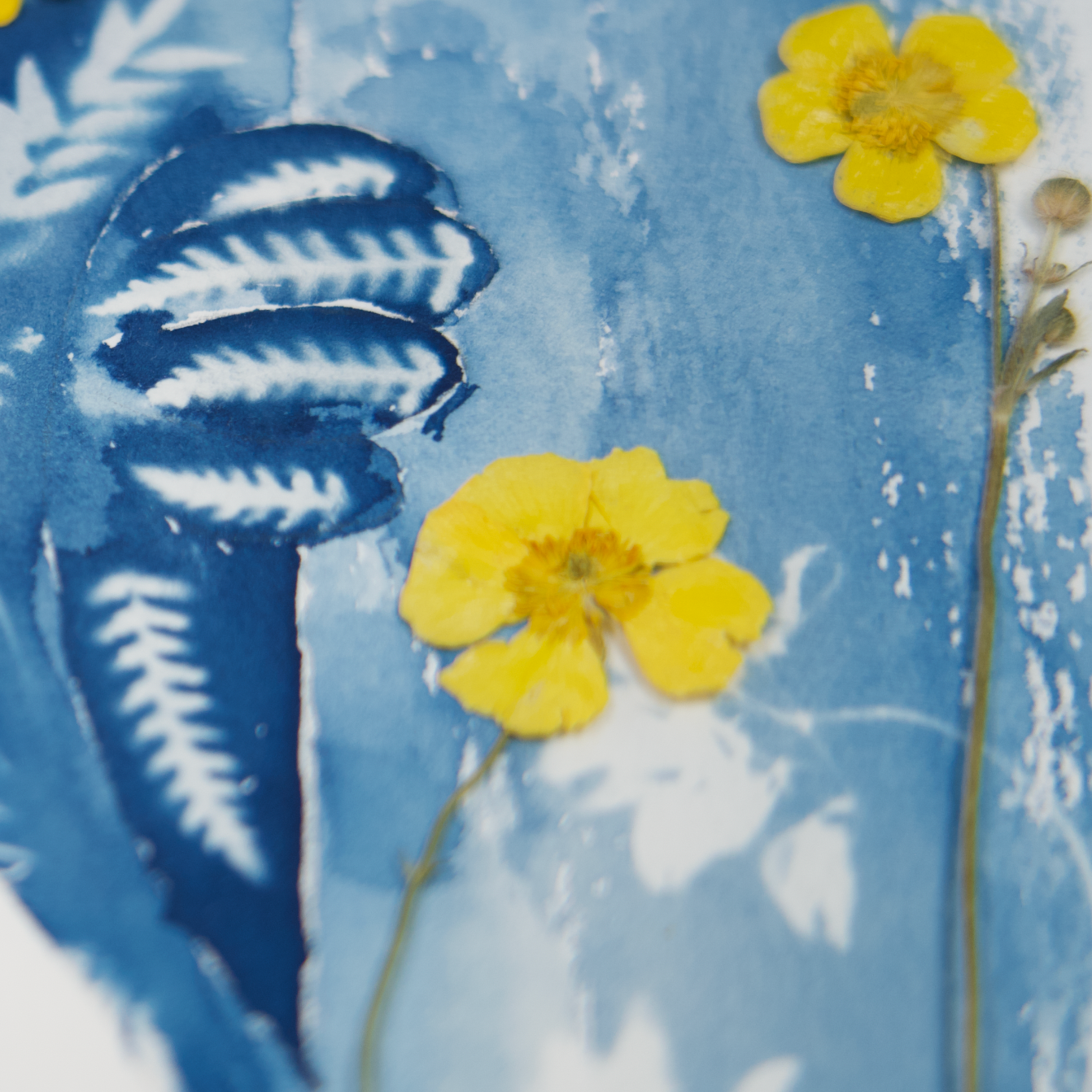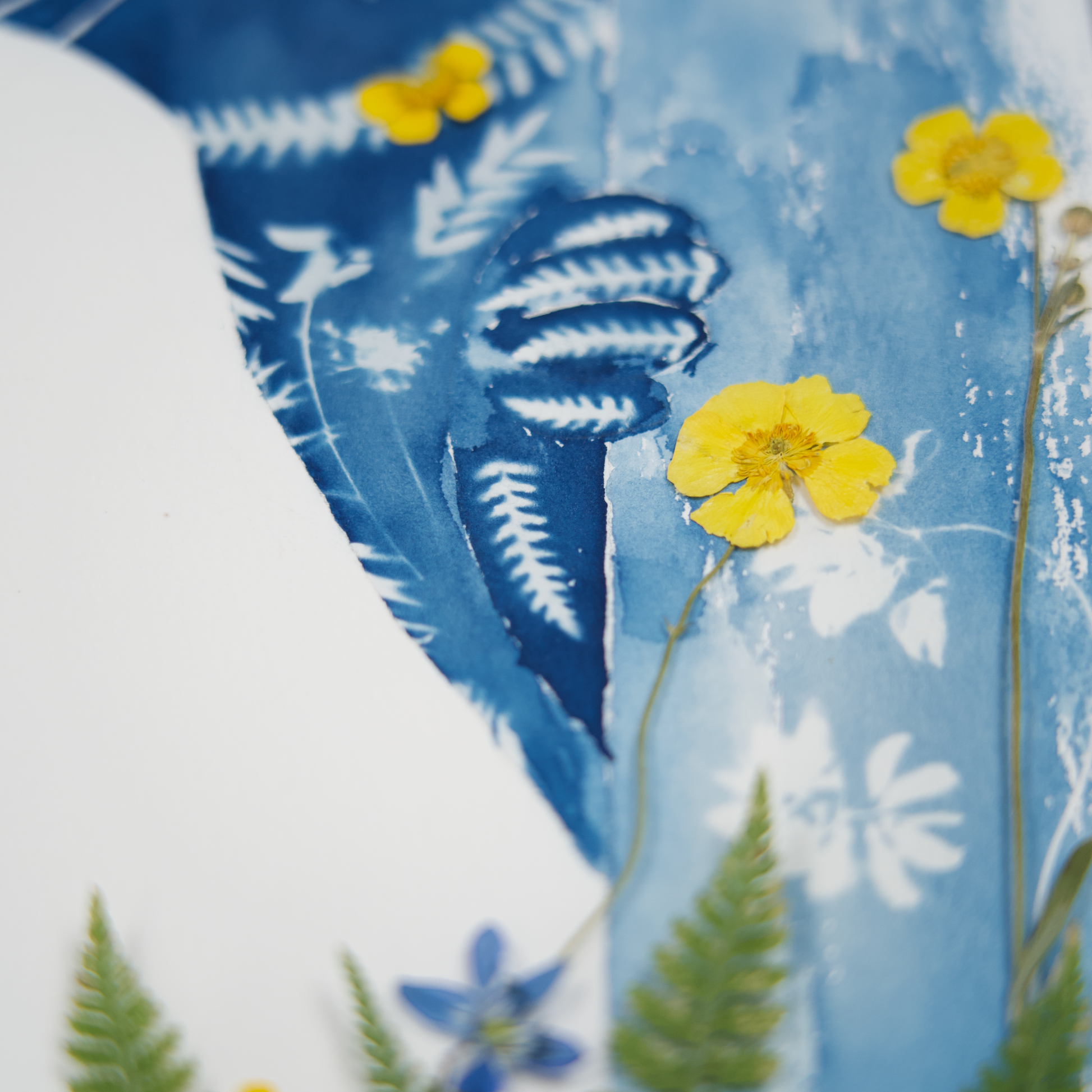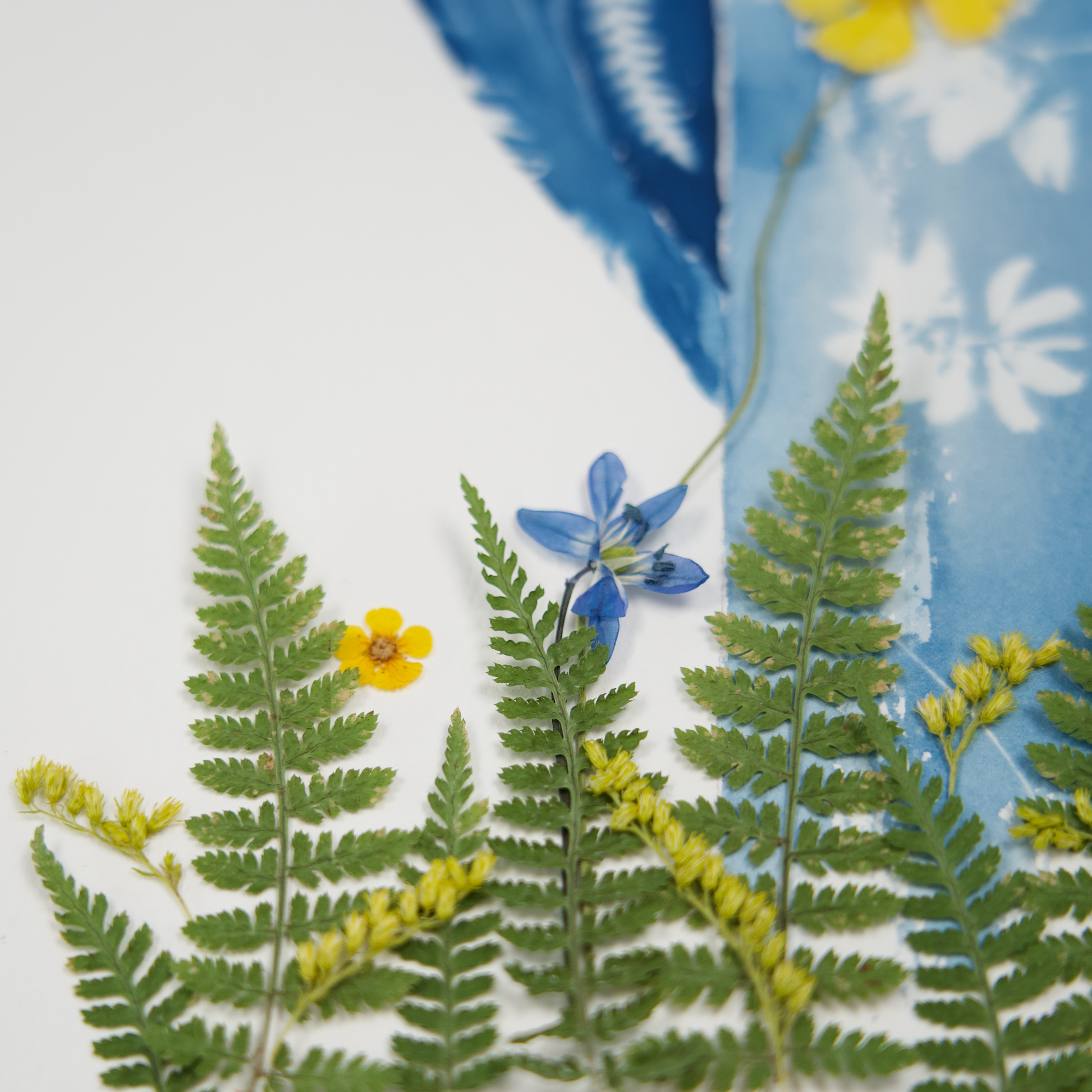 Starting with real botanicals that I have harvested, dried, and pressed throughout the seasons; the original cyanotype is hand-made using sunlight, photographic chemicals, and developed in a water bath.