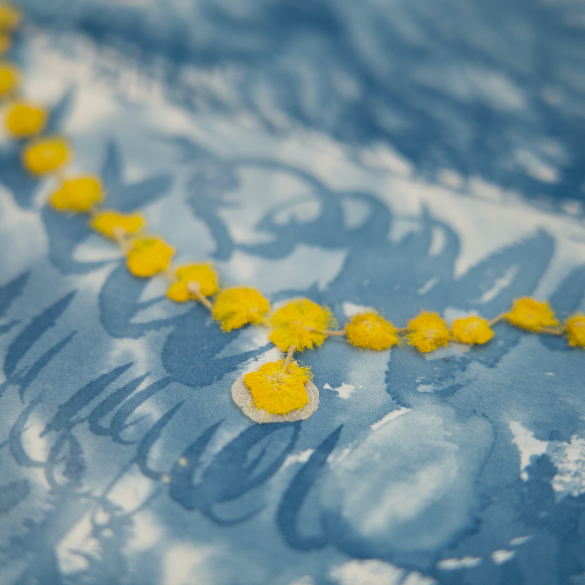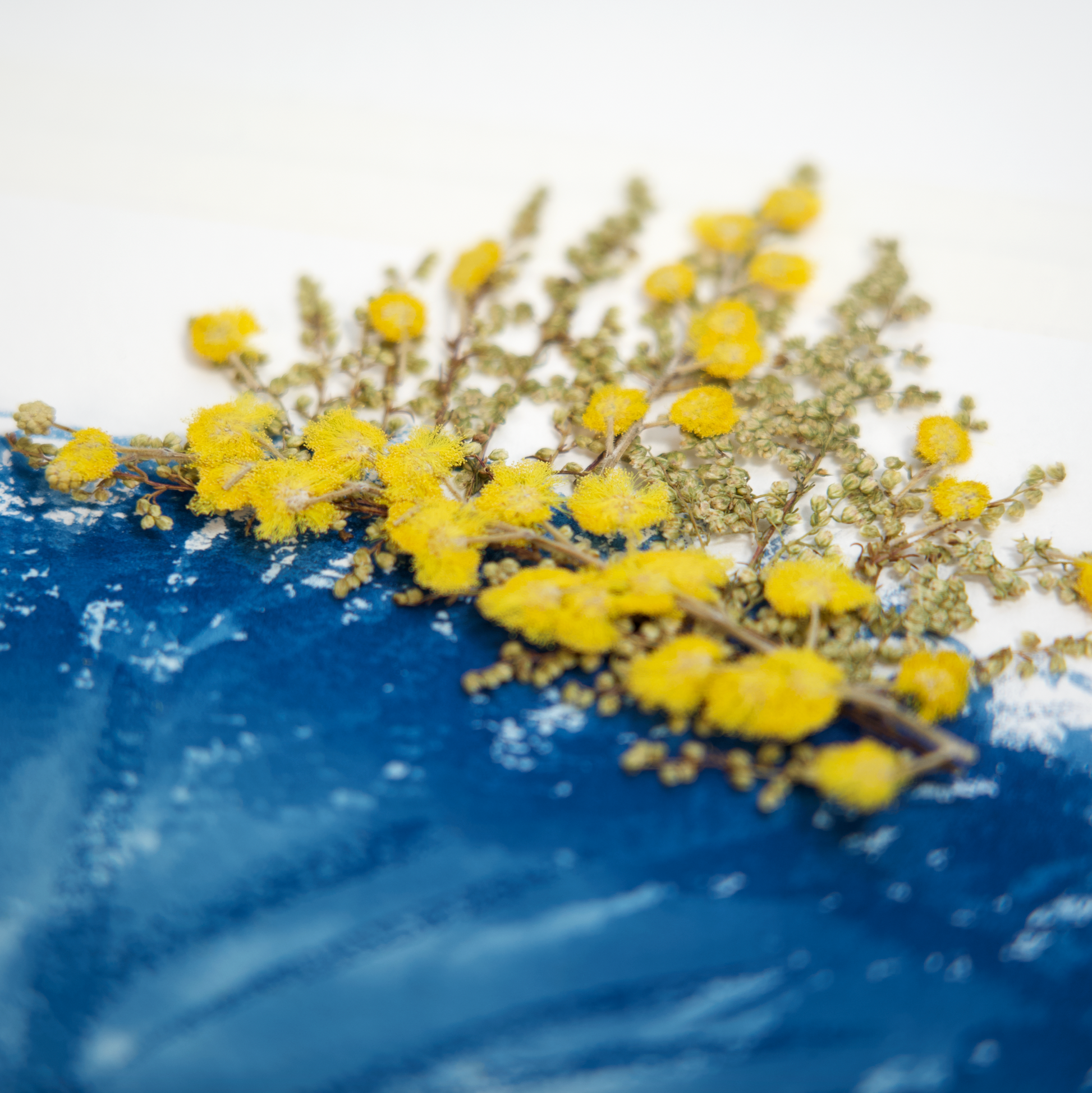 Starting with real botanicals that I have harvested, dried, and pressed throughout the seasons; the original cyanotype is hand-made using sunlight, photographic chemicals, and developed in a water bath.