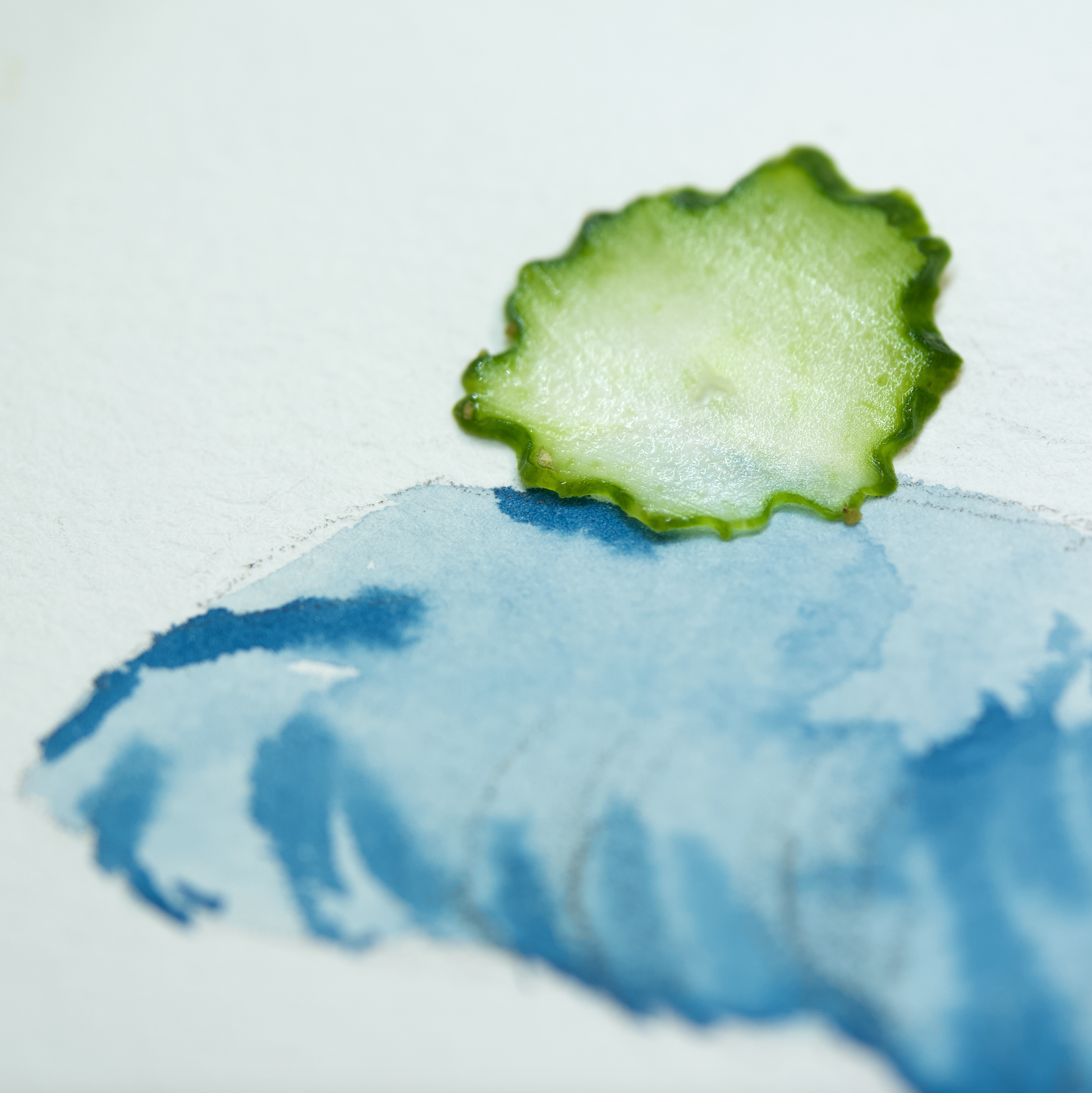 Cyanotype is a photographic process that produces a Prussian blue monochrome print. Developed in 1842, this technique utilizes a photosensitive solution that reacts to sunlight exposure. Plants act as UV shields, leaving their impressions on the paper.