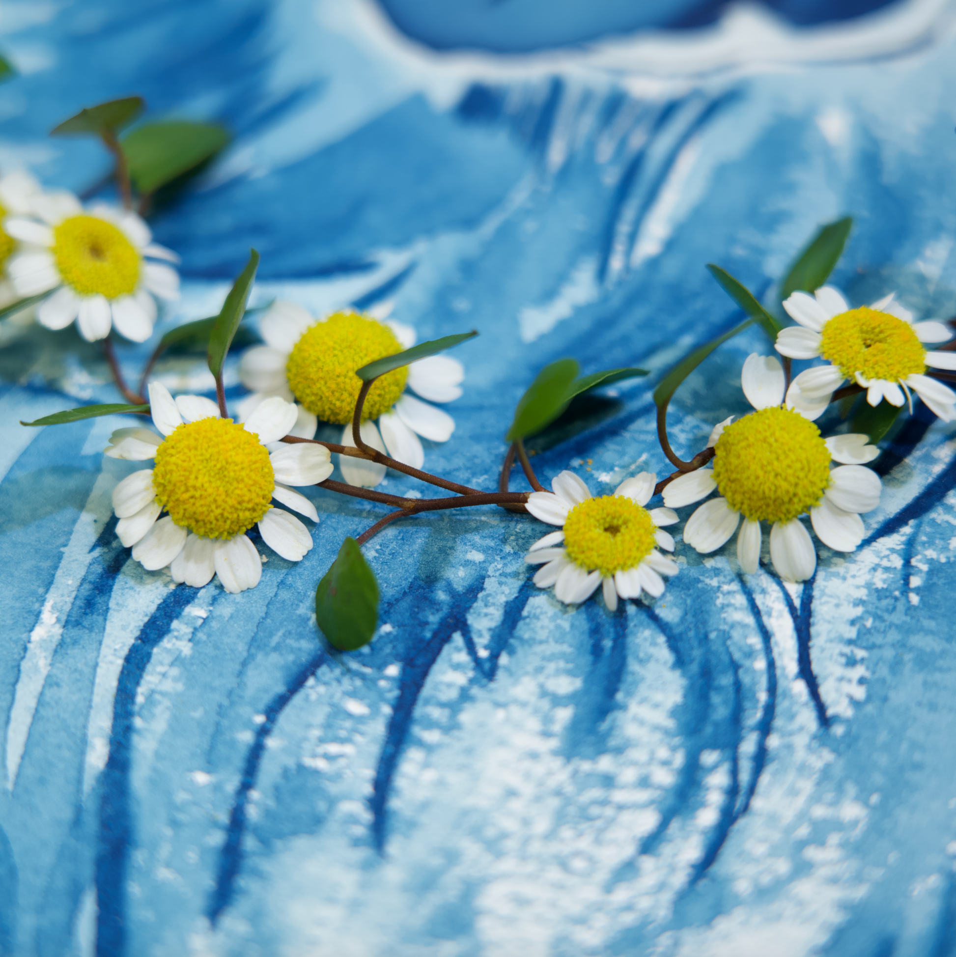 Starting with real botanicals that I have harvested, dried, and pressed throughout the seasons; the original cyanotype is hand-made using sunlight, photographic chemicals, and developed in a water bath.