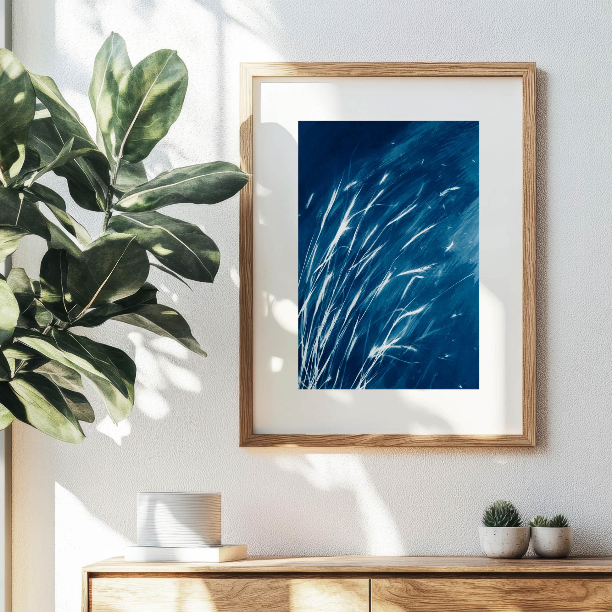 - Cyanotype sun prints navy blue floral wall decor for your living room, bedroom, or dining room. Add a touch of beauty to any space with this unique plant wall decor.