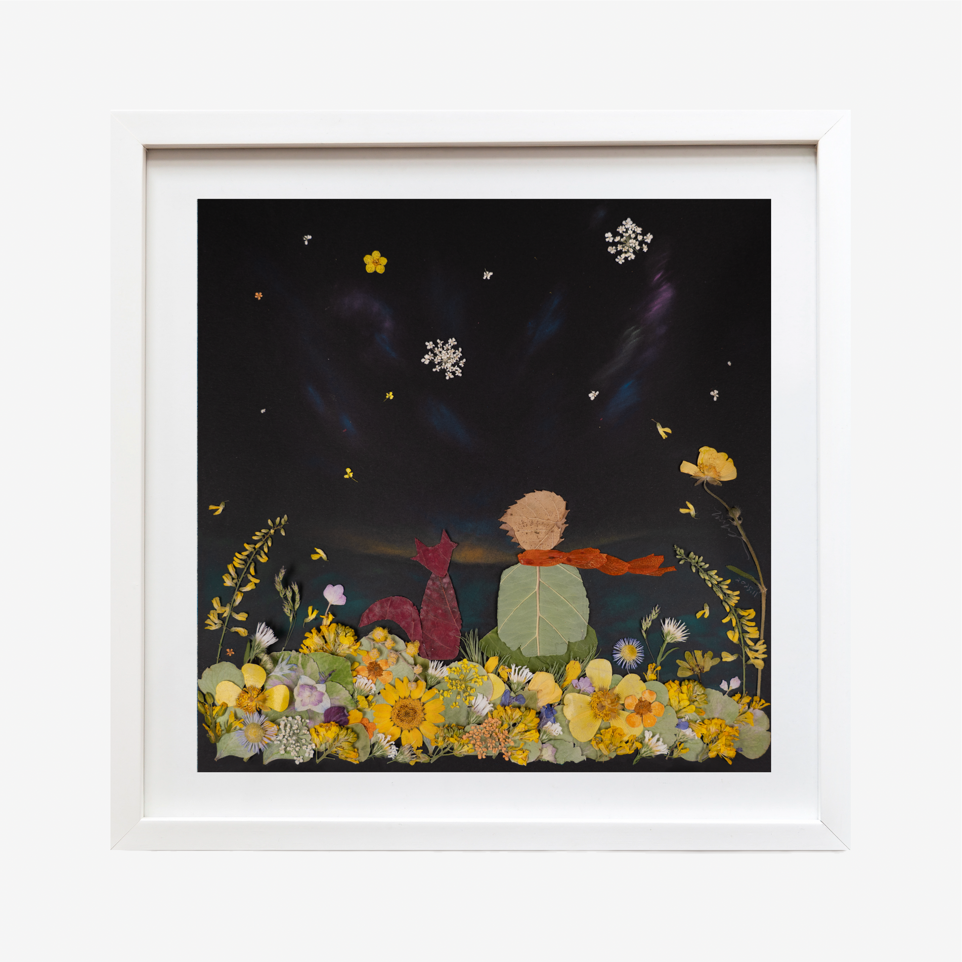 This artwork features pressed flowers. Each piece is crafted by hand using real flowers, carefully collected and pressed throughout the seasons. The process of drying the flowers requires time and patience. Once dried, the flowers are meticulously arranged, adhered, cleaned, and sealed within frames.
